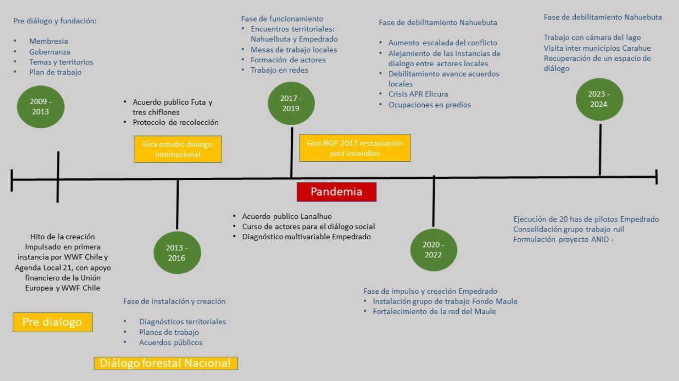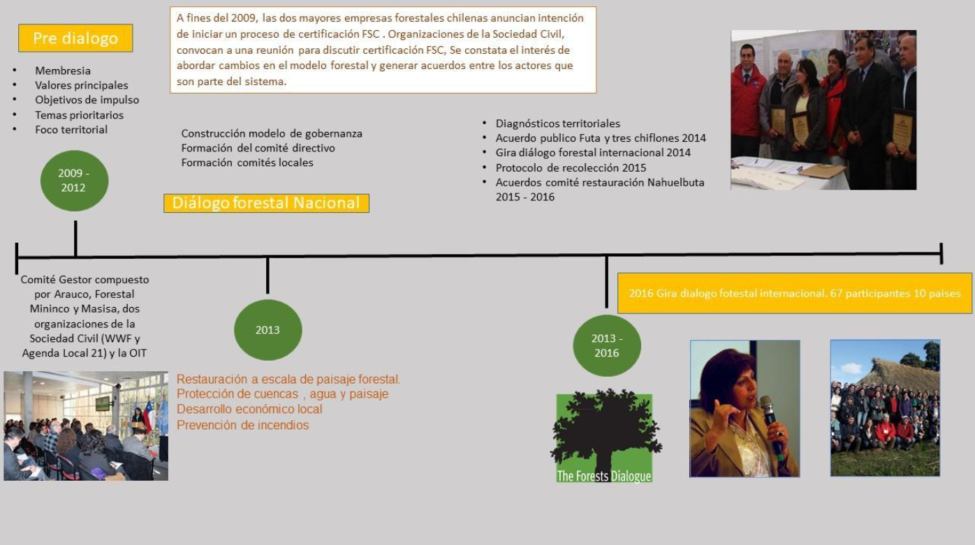 En abril de 2013, con la participación de representantes de distintos ámbitos del sector forestal, se llevó a cabo el lanzamiento del Diálogo Forestal Nacional, iniciativa que buscaba en su origen, implementar soluciones basadas en procesos participativos y de construcción colectiva. En septiembre del 2013 se conformó el primer Comité Directivo, compuesto en sus inicios por WWF, Ética en los Bosques, Departamento de Acción Social de Temuco (DAS), Comité pro Defensa de la Flora y Fauna (CODEFF), Agenda 21 y las empresas forestales Masisa, Arauco y Mininco. Como organismo asesor se contó con la colaboración de la OIT Chile.
